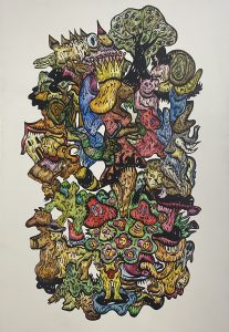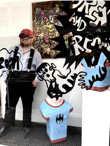 Né en 1975, formé aux Beaux-Arts de Paris et de Nantes, il a très tôt imposé une écriture plastique reconnaissable entre toutes. Chez lui, les influences circulent librement : iconographie médiévale, culture populaire, bande dessinée, références psychanalytiques ou encore fragments de contes enfantins. Rien n’est figé, tout est transfiguré. Dans ses œuvres, l’artiste apparaît souvent lui-même, multiplié, déformé, travesti. Figures de clowns, d’anges ambigus ou de personnages hybrides composent une galerie intime où l’identité devient terrain de jeu autant que territoire