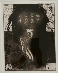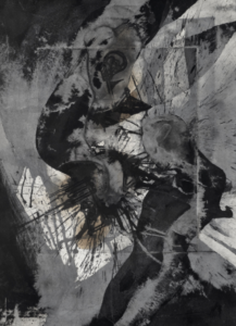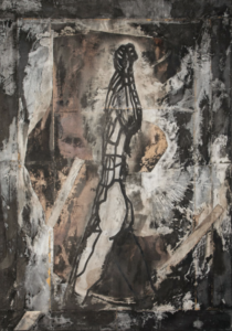 Face aux œuvres, le regard est immédiatement saisi par une présence récurrente : la figure humaine. Mais une figure réduite à l’essentiel, presque spectrale. Corps lacérés, silhouettes fantomatiques, signes noirs qui émergent de surfaces blanches ou cendreuses.